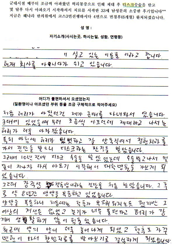 //## //## 이름 : 이용훈나이 : 33세33세 이용훈 [어디가 불편하셔서 오셨었는지] 처음 허리가 아팠던건 제가 군대를 다녀와서 였습니다. 군대에 있었을때부터 조금씩 아프던데 제대하고 나서는 허리가 더욱 아팠왔습니다. 특히 아침에 허리가 뻣뻣하고 잘 안 움직여서 정형