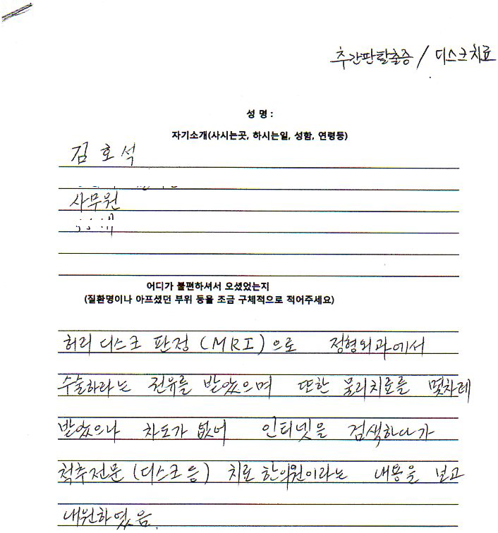 //## //## 성명:김호석 사무원 55세 [어디가 불편하셔서 오셨는지]허리 디스크 판정 (MRI)으로 정형외과에서 수술하라는 권유를 받았으며, 또한 물리치료를 몇차례 받았으니 차도가 없어 인터넷을 검색하다가 척추전문 (디스크) 치료 한의원이라는 내용 보고 내원
